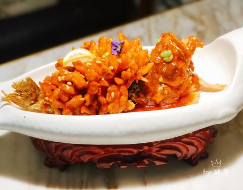 米桃还是第一次来,江南水乡的吴侬软语系风格装修,菜系出品也是以江浙菜为主。临近春节,桌上还有提了祝贺词的折扇做装饰。 姑苏松鼠桂鱼 店家招牌菜,造型还是挺美的,还有干冰制造的烟雾缭绕,鱼肉炸得有点过...