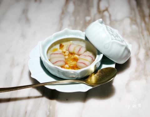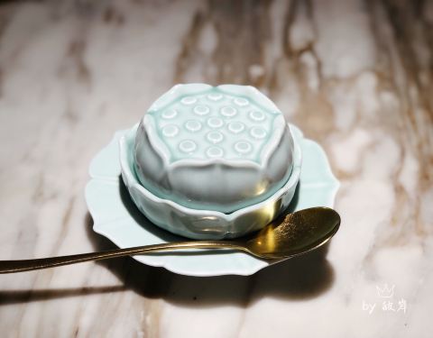 鸡头米鲜肉汤圆 样子真好看,装在莲蓬形状的浅碧色器皿里,鸡头米搭配雨花石汤圆和桃胶,看起来特别可爱