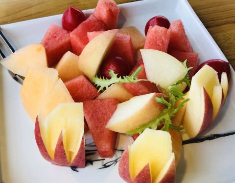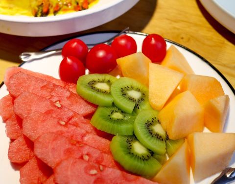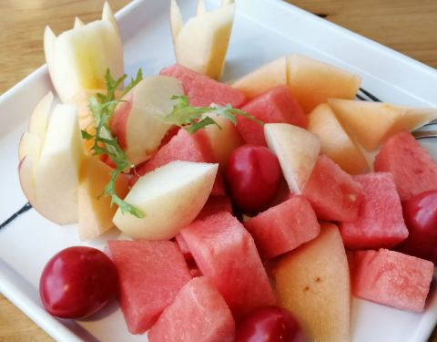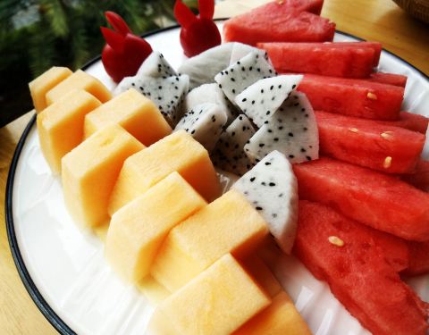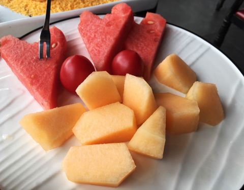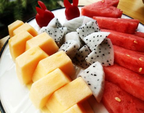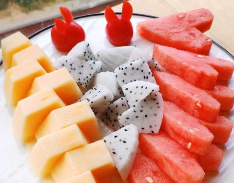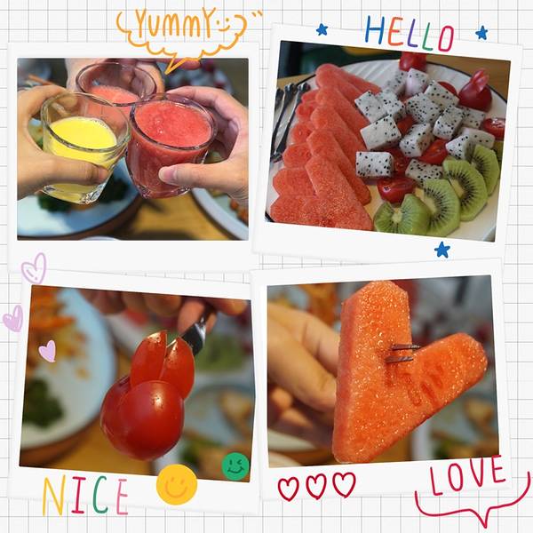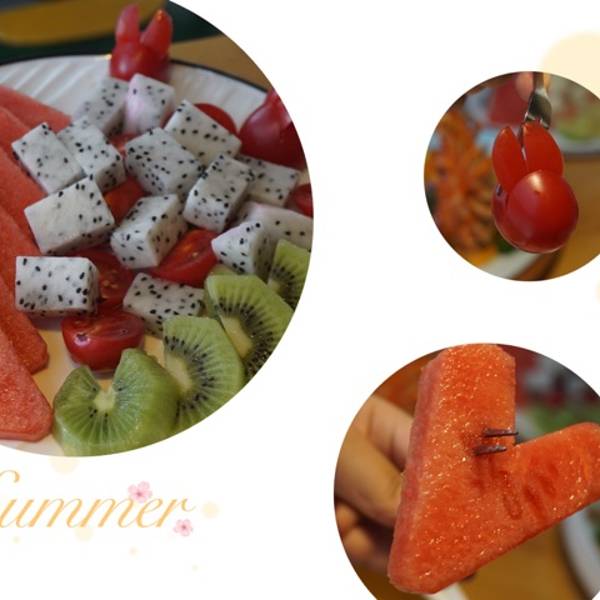 😋😋吃饱喝足,果盘不可少,每一种水果都是当季的,连西瓜都是爱你的形状,番茄也摆成了可爱的小兔子,让人不仅吃的爽口,看得也开心!
