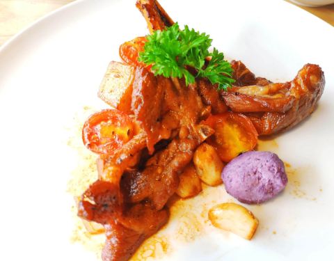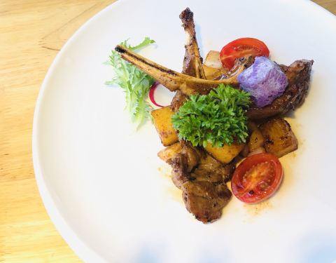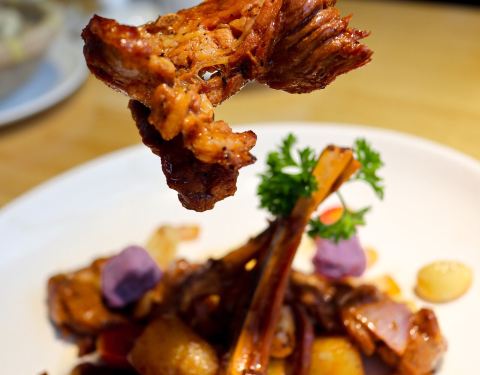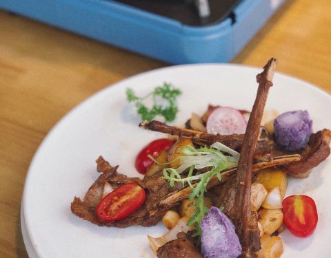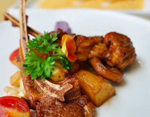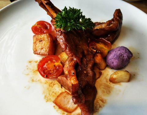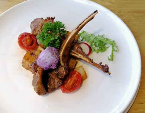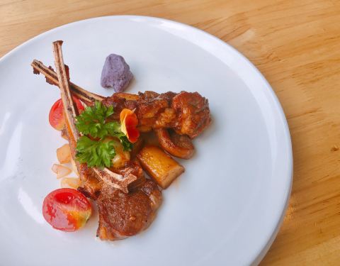 - 法式羊排配紫薯球,好看又好吃的一道菜,羊肉不错,鲜嫩多汁超喜欢。迷你芒果鹅肝球漂亮又可口