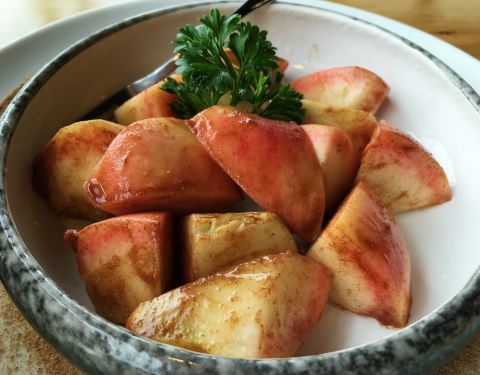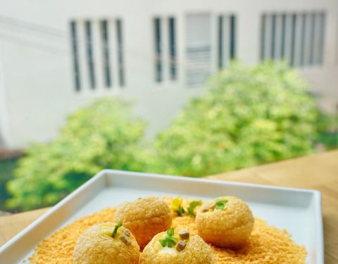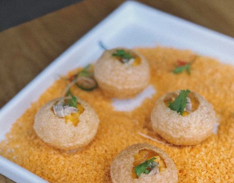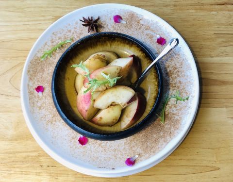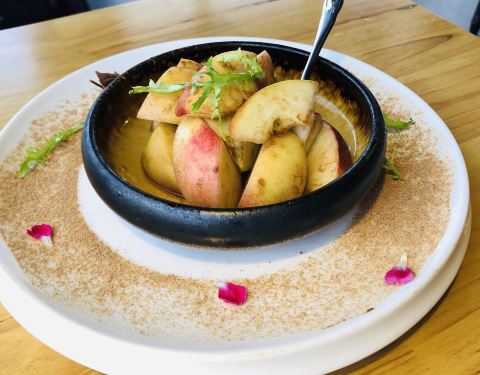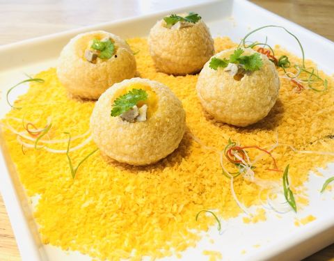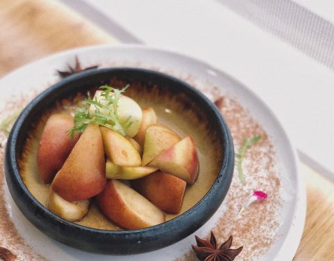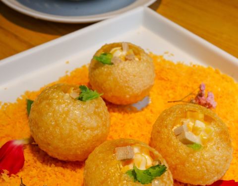 从外形来看,非常小巧可爱,酥脆的外皮里塞满了饱满切块的芒果,一口咬下去满是香甜,一不小心切块芒果掉出来,搭配着上面撒着几粒鹅肝,不过满口的芒果味已经完全覆盖了!