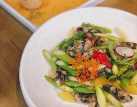 嵩屿九号海景餐厅离嵩屿码头相当的近,环境也不错,一整栋有六层楼,饭点到时候来生意可是相当的好,坐满了人。菜品好吃,摆盘也极为精致,哈密瓜汁,带着纯正的哈密瓜香,鲜甜可口,相当的不错。海苔炒饭,米粒颗粒分明。堂煎小龙虾,新鲜的龙虾肉,用心剥离出,肉质弹牙,可口,香辣蟹,新鲜的蟹,满满的膏,肉质肥美,辣压去腥味。迷你芒果鹅肝球,可爱的造型,铺满的芒果丁口感丰富。法式羊排配紫薯球,羊排没有膻味,细嫩的羊肉,口味不错,竹荪浸文蛤,汤很鲜甜,入口很舒服。