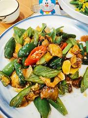 回锅肉的煮法,三层肉切得很薄,搭配辣椒青椒一起炒,吃起来有点点辣,非常入味,不错的下饭菜。