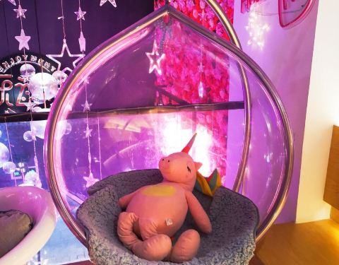 推荐在二楼用餐,静谧的环境,活泼的色调,柔和的灯饰,还有网红玻璃球吊椅、公仔、浴缸,这样的环...