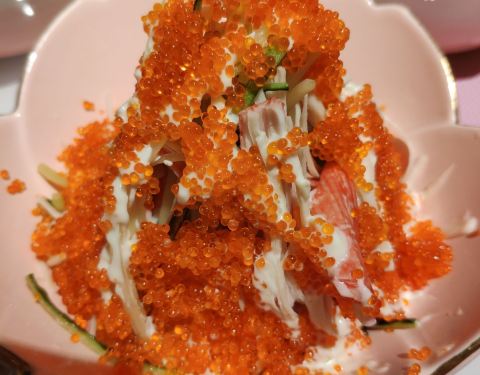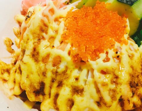 鲜虾,三文鱼🍣,蟹柳,沙拉炙烤过的刺身,吃起来鲜美可口,一份精美的主食。