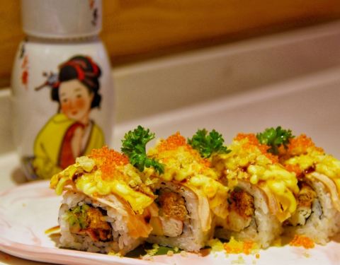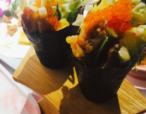 清新芒果寿司卷也不错,有蟹子,沙拉,芒果结合,一口一个很满足。