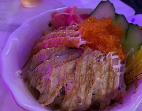 一家网红餐厅,果然超粉嫩的,一进来就被粉色的花墙吸引,还有和服👘,雨伞☂️,木屐,蝴蝶结🎀等装饰物,感觉更像一个小影楼,可以随意搭配拍照,圆你的和服梦。 一家精致的日料店,位置不多,小小的挺温馨的,满满的网红元素,所以很受女生欢迎。 最爱这里的炙烧三帝盖饭 鲜虾,三文鱼🍣,蟹柳,沙拉炙烤过的刺身,吃起来鲜美可口,一份精美的主食。 清新芒果寿司卷也不错,有蟹子,沙拉,芒果结合,一口一个很满足。 大福 吃起来口感绵密,不错的甜品。 #哆啦爱美食# Tips 【餐厅名称】乐云棚网红料理 【餐厅地址】镇邦路47号 【所属菜系】日料 【人均价格】60+ 【特色美食】炙烧三帝盖饭
