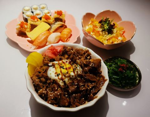 这家粉色系的日料店,去了就想谈恋爱 乐云棚网红料理位于镇邦路47号,隐藏在中山路旁的巷子里。一进餐厅,网红ins粉色系装修风格再加上随处可见的人偶、面具、提灯、油纸伞等日本元素的点缀,给人唯美浪漫的感觉,完美的设计颠覆我对日料店的传统装修风格的印象。 推荐在二楼用餐,静谧的环境,活泼的色调,柔和的灯饰,还有网红玻璃球吊椅、公仔、浴缸,这样的环境不仅适合品味日料的魅力,更让人忍不住拍拍拍,餐厅还提供和服,穿上和服拍照打卡,真是敲美哦。作为单身狗,在如此粉嫩梦幻的餐厅,真的有想去谈恋爱的冲动❤。 【寿司】这次点了什锦寿司拼盘和曼谷风情卷,不同种类的寿司带来不一样的味蕾体验 。 【芝士焗大虾】芝士味浓,虾肉鲜甜,虾的个头也不小。 【牛肉饭】份量十足,满满一大份牛肉,这么大的份量适合两人食用,牛肉饭上还有粒温泉蛋,一口吃下去超满足。 【芒果蟹子沙律】芒果粒、蟹籽和沙拉完美地融合在一起,酸酸甜甜的,营养丰富。 【三文鱼头】虽然造型有点吓人,不过微焦的鱼皮香香脆脆的,鱼肉肉质软嫩,特别入味。 人均大约100元,很喜欢这样让人少女心满满的餐厅。