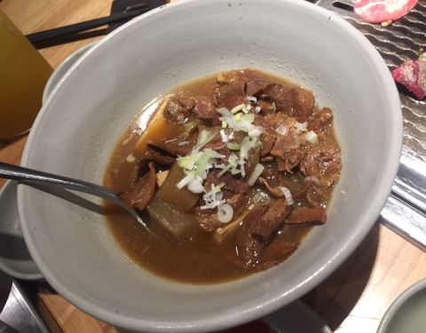 和朋友万象看完电影,找个地点边吃边聊,焱铁烧是个不错的地方,边烤边聊,喝喝饮料。听着肉肉在铁板上滋滋的美妙声音很是开胃。 牛肉粒,牛舌,培根,五花肉,香肠,都不需要酱料,原滋原味的好肉就很足够了。搭配生菜解腻。生菜还用红椒捆起来好看的。烤完肉,还有一份招牌炖肉份量真的超级足,两人份吃得饱饱的。