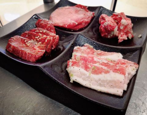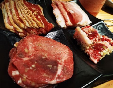 炎铁烧,万象城3楼,几次路过都需要排长队,今天赶早,17点出头就来,终于不用排队啦,哈哈,开心。 环境时尚舒适,服务员很礼貌周到,网上还有团购优惠套餐,很是具有性价比。一坐定,就送来四款餐前小菜,爽口开胃。 烤肉组合,四款拼盘,分别为盐烤牛舌、蒲烧肥牛、葱盐五花肉和中落小排等,都非常的新鲜,自己动手烤,有趣又美味,工作人员也会勤快地过来指导,换烤盘等。 主食还搭配有海苔,用脆香的海苔来包裹Q弹的米饭,真心好吃。
