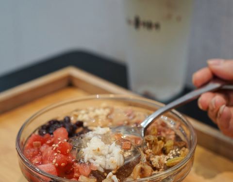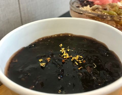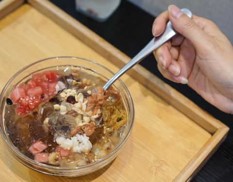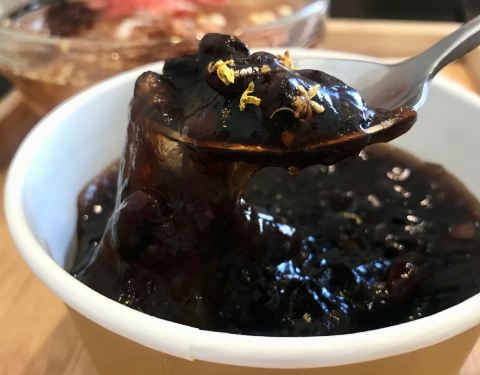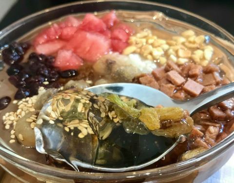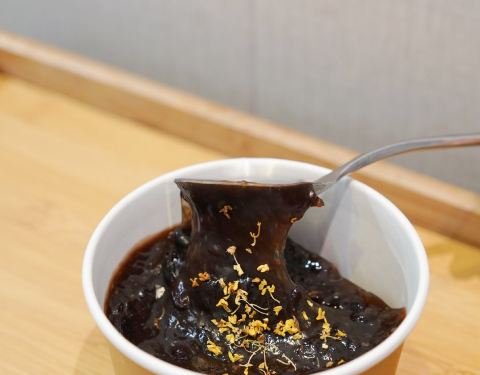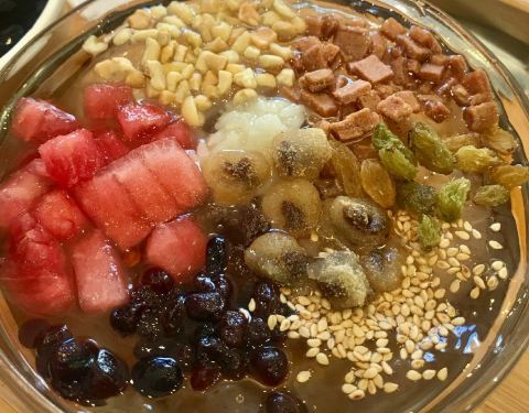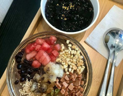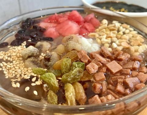 黑豇豆混地瓜粉,却很像红豆沙混合藕粉的口感,但藕粉是糯而嫩的,豇豆莳却很有韧性,拉都拉不断,一勺子可以把整碗舀起来。 口感温温热热的,能吃到煮糯的黑豇豆,还能闻到桂花的香气。 大满贯冰粉 也是他家点击率很高的一款甜品。冰粉的口感真的嫩啊 夏天吃超爽的! 酸酸甜甜的葡萄干和山楂,粉甜的红豆,清爽的西瓜,花生碎和白芝麻增添香气。最喜欢里面的小麻糍,糯唧唧的。 一般不喜欢料很多的甜品,感觉会影响了冰粉本身的味道,但他家的份量控制的很好,竟然不会觉得累赘。 蜜水凉菜膏 也是个神奇的东西,像爱玉仙草之类的口感,但有点脆嫩,还会有薄荷的凉意。 主打台州小吃甜品,价格不贵,蛮多都很有特色。