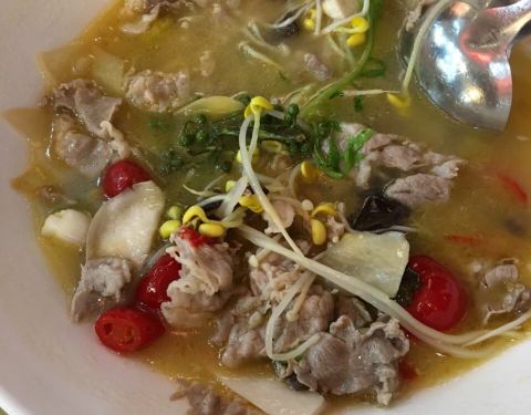 酸汤肥牛、跳水田鸡、水煮鲈鱼,都是不错的招牌菜,味道也很正宗、地道,鱼片做得很鲜嫩,好吃,田鸡味道也不错,搭配上冰凉的毛根竹蔗水,赞。