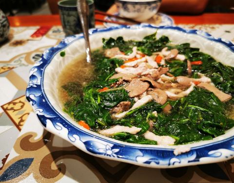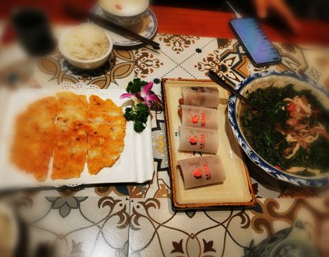 主打陈皮菜的一家小餐馆,地方不大,没有洗手间是败笔,胜在小哥哥很帅服务很到位 菜品价格在珠城来说算中规中矩 陈皮川贝桔梗炖雪梨料很足,陈皮大大块,不过不知道年份 香口爽脆陈皮骨例牌有四块,是加了陈皮粉炸的肋排,不油腻而且味道还不错,可惜拍照的时候忘记把纸去掉让露真容了[快哭了] 陈皮猪润枸杞叶就是上汤猪肝枸杞叶里面加入了陈皮丝 最惊艳的是陈皮墨鱼饼,陈皮粒是必不可少的,然后墨鱼饼里面除了一般店会用的墨鱼肉粉之外还加入了原块墨鱼肉,吃起来有点像吃喜茶的脆脆波,特有口感 送的红豆沙也是有陈皮丝的哦,煲的时间好够好沙好好吃[强]