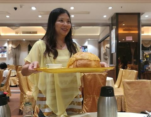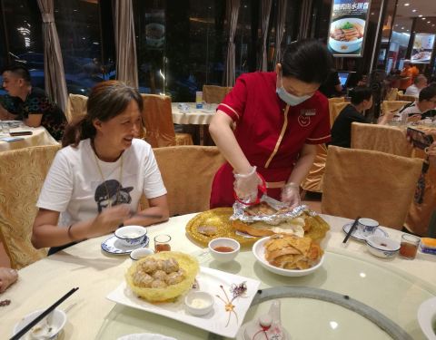 这里最出名的是酥皮面包鸡,好像广州独此一家,需要提前一天预定。我们还定点了藕尖爆牛肉,上汤桑叶,花甲肉小炒皇,杏味鱼球(名字记不清了),出品都不错。