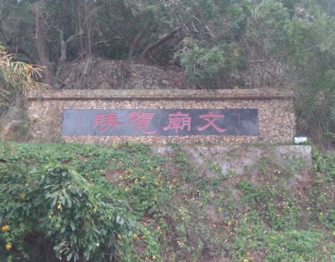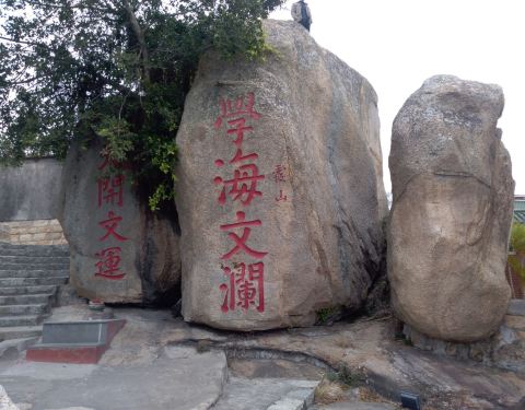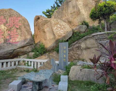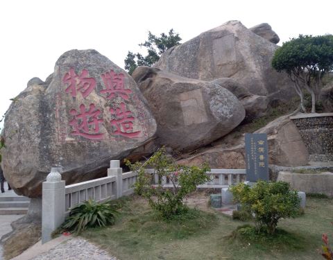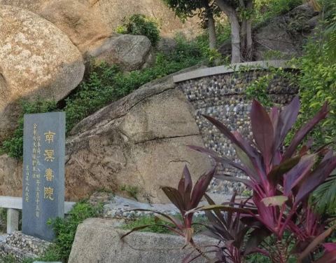 东山岛的南溟书院在风动石风景区旁边的山顶上,山其实不高的,但地理位置不错,视野开阔,可以居高临下瞰视风动石景区,书院装饰很好,旁边巨大的石头上刻了一些字。