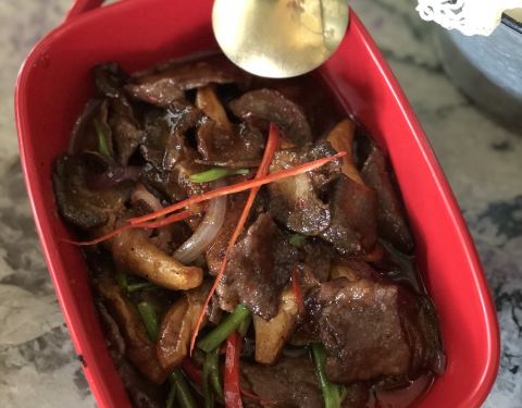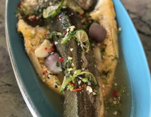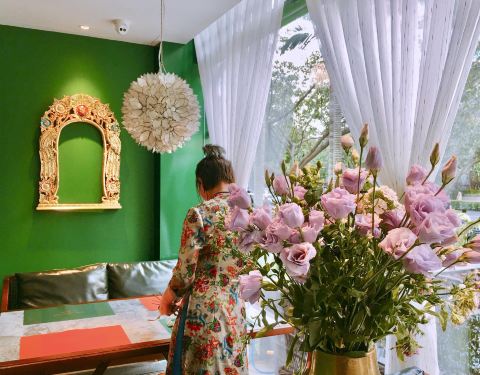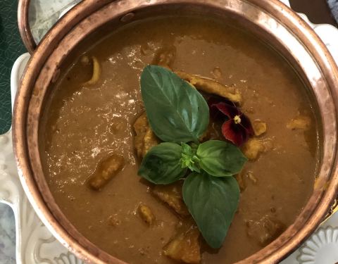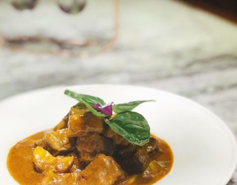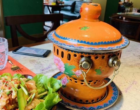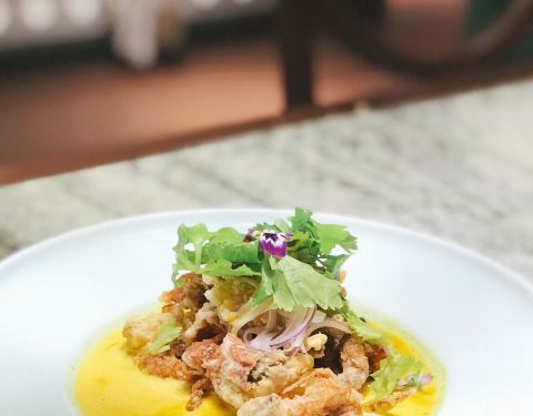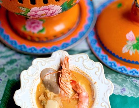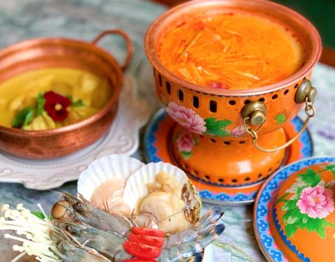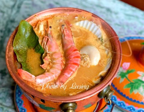 建业路,马可波罗酒店边上,一栋绿色小楼。环境挺不错的,明厨亮灶。菜式是东南亚菜系。点了咖喱虾,味道很不错,咖喱汤汁浓稠,黑虎虾个头肉多特别下饭。选了个菠萝汤底的海鲜小火锅,双人份的,锅具就特别好看,有点复古宫廷风格,火锅汤底也挺有味道,不像冬阴功那么浓郁,但也不会寡淡如水。还有个什么皇室前菜,值得一试。还有他家的桌面绿植是蔬菜。