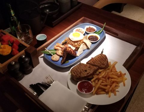 早餐特别丰富,有各种面包,水果,饮品,当地特色菜。晚餐可以送餐到房间,菜品有限,但是都是精品,味道不错,菜品很精致,很好。