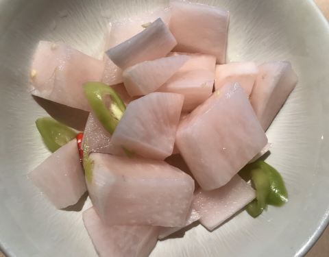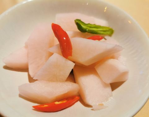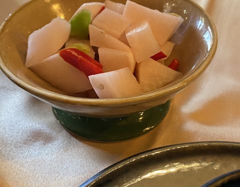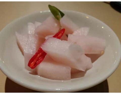 吃贵州菜的餐厅,中午的时候人也挺多的,说说是贵州菜,但是装修的非常时尚呀,有点像酒吧,放的音乐也很嗨。餐前送的酸萝卜还挺爽口的。