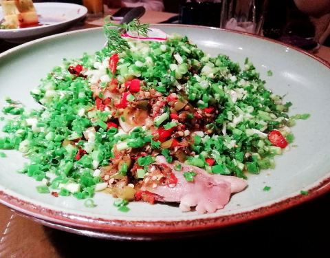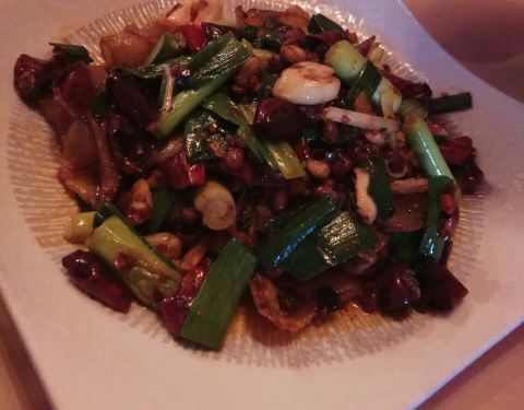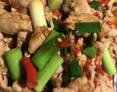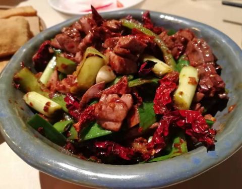 - 糟辣炒肉片,量挺足的,这道菜不是很辣,肉也比较嫩。好评挺高的一家店,据说要排队很久,就特意很早前来