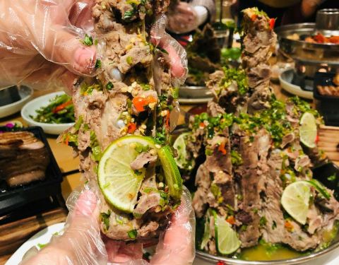 「火山排骨」从样貌上感觉还原度很高,光看排骨就最起码有4斤以上,而且用的还是很大块的那几根,骨头上面肉也很多!服气! 戴上手套就开始毫不顾忌形象地开啃!量还是可以的,我们一人一根就已经有点饱了! 排骨...