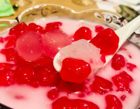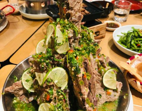 「火山排骨」从样貌上感觉还原度很高,光看排骨就最起码有4斤以上,而且用的还是很大块的那几根,骨头上面肉也很多!服气! 戴上手套就开始毫不顾忌形象地开啃!量还是可以的,我们一人一根就已经有点饱了! 排骨味道是有点酸酸辣辣的,很泰国!上面铺满的青柠就很下血本了吧,底下的汤汁里面也吃得出浓郁的青柠清香! 里面用的辣椒也不太一样,不是那种普通的国内辣椒,估计也是泰国的某种辣椒,很香的!店家走心了! 「红宝石椰汁冰沙」也是很奇妙的口感,石榴红红的,加上马蹄的清香融合在一起,嚼着特别过瘾,软糯+爽脆的双重感受,添加了一些亚达籽在里面增加口感的多样性,再喝一口椰汁!爽! 「冬阴功海鲜锅」是真的值得点!汤底是用一整只龙虾熬出来的,完全是西餐的做法,汤里铺满白虾和青口贝,底下还有龙利鱼,关键是汤真的好喝!点名表扬。 「安达曼手工虾饼」也是百吃不腻,配上店家自己做的梅子酱,酸酸甜甜很开胃! 还要表扬的是这里送的免费龙虾片!是真的好吃!!那个绿绿的香兰叶柠檬汁,也是每次必点!!很解辣!!