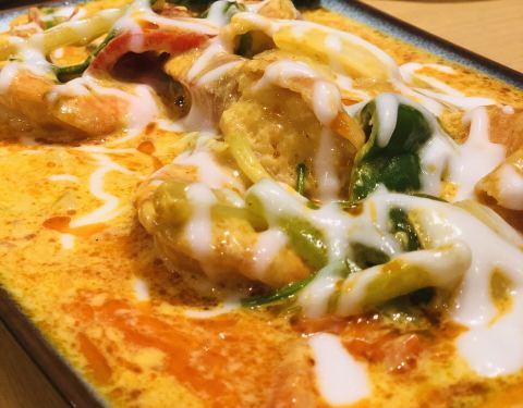 之前在他家另一家店吃过。店面很容易辨识。装修风格走东南亚路线,小摆设好漂亮。 中午有套餐,单人、双人或4人都有。会员生日还有优惠券。 【黄咖喱大虾】蛮好吃的,虾新鲜,黄咖喱不辣,酱汁浓郁,拌饭刚好。 【椰肉炖母鸡汤】量超级大,里面居然还有鸡血。只是这道菜的食材和【罗勒绿咖喱鸡】一模一样啊!只有酱汁不同。 【祖母酱肉末茄子】是他家最好吃的一道菜了,茄子入味超软糯。