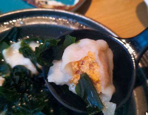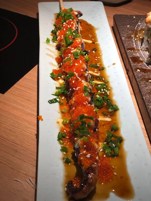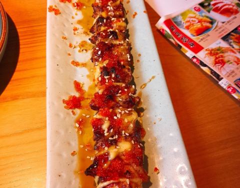 以前在大丸百货吃过一次,觉得还可以,这次来火车站觅食,搜到这里也开了一个,就来试试。周六晚上虽然人气没大丸旺,不用等位,不过也基本满座,而且两人可以坐四人的卡座,不会发生桌子太小菜不够放的尴尬。 鹅肝寿司一如既往的美味。 海胆饺子不错,汤也鲜。 鳗鱼饭有一丢丢腥气。 章鱼串很大只。