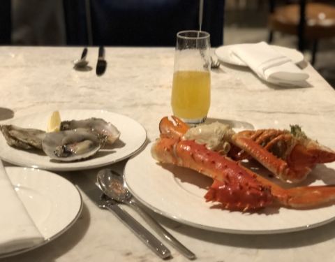 之前心水柏悦的早午餐,没想到有善人请客,先来瑞吉拔草了哈哈。现开的生蚝,硕大的小青龙和帝王蟹,家禽类也很赞,哪怕一个素菜都如此好吃,听说一个月只做一场,真的是开了眼界了,还有三文鱼,听业内人事说,吃日料还是要来五星酒店吃,品质流转新鲜程度其他的小店是不能比的,不停地在吃三文鱼,只能劝自己适可而止,还要留第二个胃给甜品,从11点多吃到下午3点多不带停的,太爽了,不点酒的话486好像,比日料自助贵了100多,但是甜品和菜品的选择多了好多,生蚝也是太新鲜,吃了6个不敢多吃了,有机会一定要再来