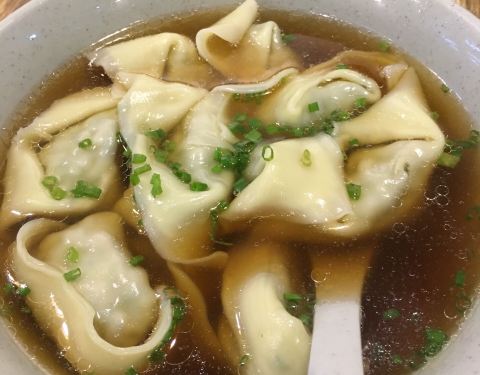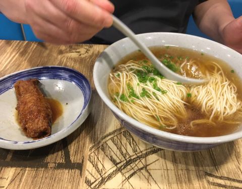 寻着网红金桥阳春面第二名来的,晚饭时候客人不算多,小店蛮干净的,老板娘是阿拉上海人,管理的不错,桌子上放着整瓶原装的香醋和黄牌辣酱油,不会像有些店里给客人用的是勾兑的调料。主角阳春面当仁不让地上了当地的金榜,汤清(宽汤)、面健(细面有劲)、油香(猪油飘香)、葱绿,色、香、味都有了,赞,如果汤色再稍微浓一点会更好,浇头要了第一次尝试的黄酱,原来是腐皮包肉,和名字完全不搭界的,好吃。大馄饨也不错,皮稍微硬了一点点,荠菜鲜肉挺香的,汤里也有猪油。