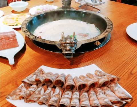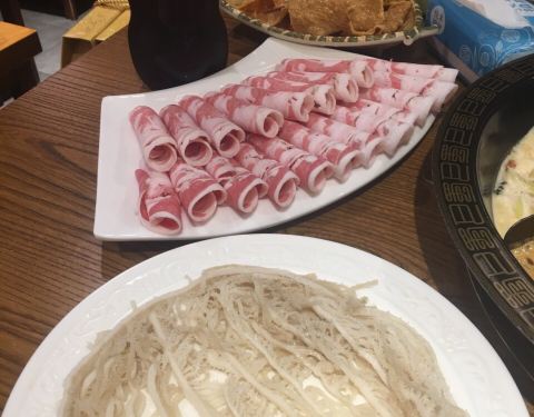 锅底要了老妈蹄花高汤,确实很鲜美,而且不腻味,有大约4大块猪蹄,吃起来还是挺过瘾的,点了手切鲜羊肉,挺嫩的,但是稍微有点柴,其实羊肉还是要肥一点好吃,其他涮菜品种挺多,中规中矩,值得推荐的是这家的炸豆皮,很有嚼劲,烫的时间略长也不失口感,他家工作日的午市套餐性价比还不错。