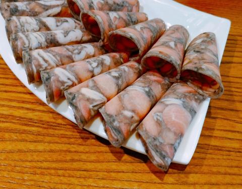 - 第一次吃到传说中的乌鸡卷,花色挺特别的,口感鲜嫩润滑。自助调理可以选择的余地很大,种类丰富,6元一人