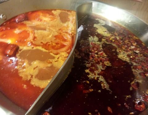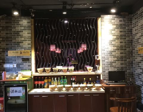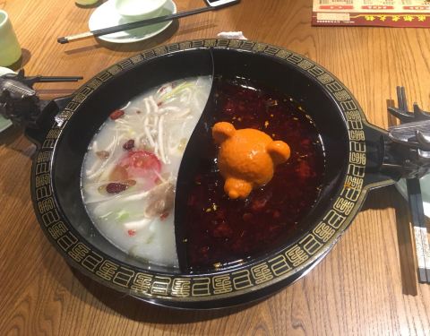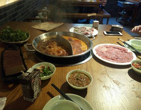 朋友中的霸王餐券,周末正好一起碰个面吃个饭。位置在海阳路靠近上南路口不到100米的地方,离家挺近的。装修古色古香,看上去还可以,一楼不大,就两张小桌三张大桌。一开始以为就一楼五张桌子,还在想这店也忒小了吧,后来发现进门口的左手边有个楼梯可以上二楼,二楼还有位子,不过我们没上去看。调料区域在进门的右手边,就一些普遍的酱料,没看到有免费水果之类的,菜价看上去还算适中。我们点了个鸳鸯锅,还点了豆皮、鱼片、牛蛙、生菜、金针菇、千层肚等等。锅挺特别,有两个龙头装饰,辣的锅底里还放了个小熊牛油,挺可爱。辣锅里不知道是不是因为煮了牛蛙,浮起好多的辣油泡沫,后来让服务员帮忙捞掉点。捞的多影响辣味,不捞掉看上去又不舒服。牛蛙挺新鲜挺嫩的,鱼片也不错,豆皮也还可以,总体味道还行吧。