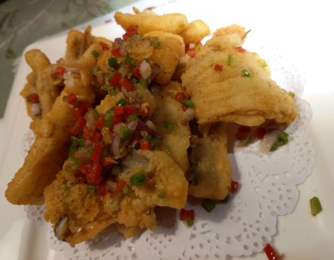 本帮熏鱼摆盘挺漂亮,炸的表皮脆,淋的酱油风味挺好,还有甜蜜蜜的口感。 椒盐龙头烤风味不错,足量