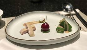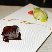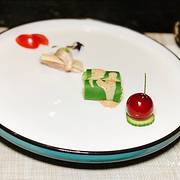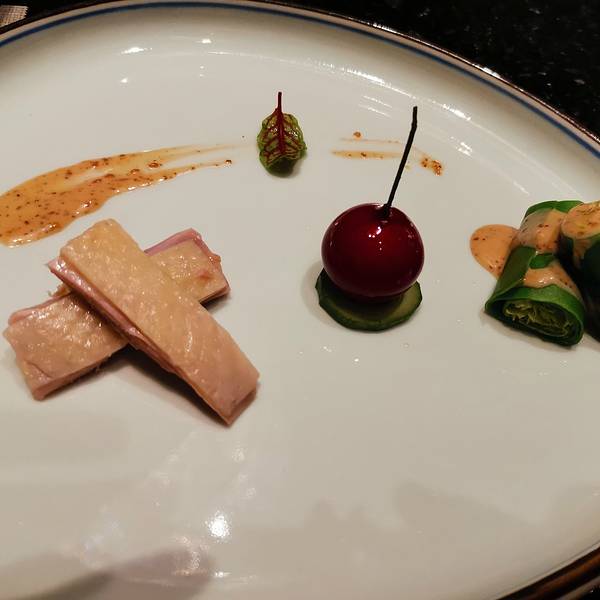 樱桃鹅肝 轻轻咬开樱桃外皮,里面藏着的内里则是绵密细腻,入口即化的肥美鹅肝酱。酸甜与咸鲜的口感融合得很自然。