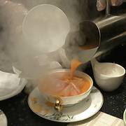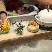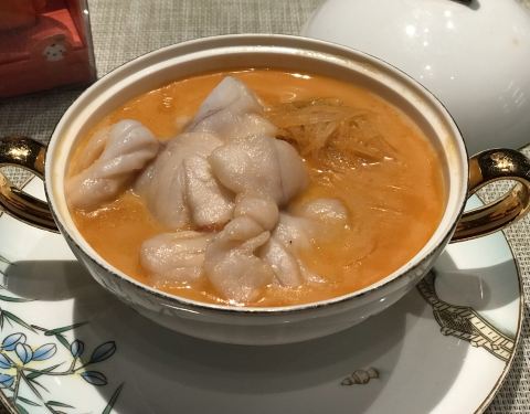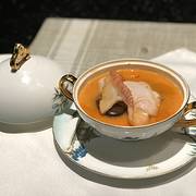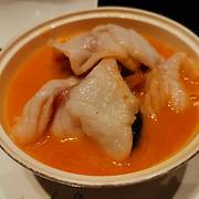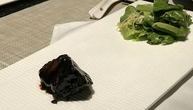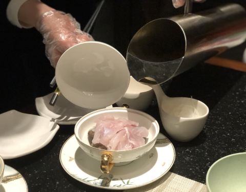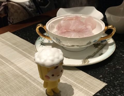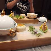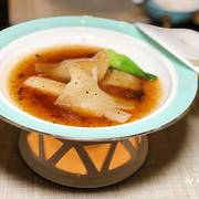 冲浪东星斑 加热过的鹅卵石上铺满了萝卜丝和东星斑鱼片,然后淋上龙虾高汤,肉眼可见东星斑加热烹熟。汤鲜美浓醇,喝得干干净净。