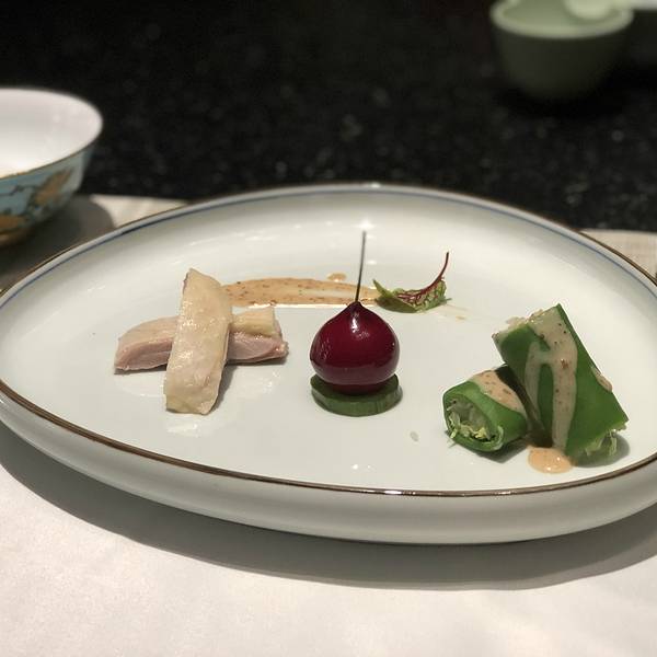 碗碟上的江南风光,菜肴里的春水煮鱼。上海南站附近隐藏着嗲餐厅。环境禅意十足,古典气息浓厚。古筝、松柏、孔雀、竹木鸟笼。。。装饰上可见用心。 碗碟上是西湖胜景的画卷,三潭映月、断桥山水在餐具上徐徐展开。 樱桃鹅肝 轻轻咬开樱桃外皮,里面藏着的内里则是绵密细腻,入口即化的肥美鹅肝酱。酸甜与咸鲜的口感融合得很自然。 招牌农场咸鸡 选用农场土鸡做原料,咸鸡咸鲜可口,极富咀嚼感。 蔬菜卷 融入天然蔬菜汁制作好卷皮,里面包裹着蔬菜,清新爽口。 香煎芦笋卷 肥美的五花肉肉里包裹着清脆芦笋。 冲浪东星斑 加热过的鹅卵石上铺满了萝卜丝和东星斑鱼片,然后淋上龙虾高汤,肉眼可见东星斑加热烹熟。汤鲜美浓醇,喝得干干净净。 文火雪花牛肉配果蔬 雪花牛肉肉质鲜嫩肥美,十足入味,搭配旁边的清爽蔬菜一起吃口感更佳。 黑松露配花胶 大块花胶以高汤小火慢炖,又有黑松露的美味加持,鲜到眉毛掉下来。花胶酥软可口,满满的胶原蛋白。 烧鹅酥 做成天鹅形状的烧鹅酥 和 蔬菜包 生煎蔬菜包味道还可以。 银耳木瓜雪蛤 女孩子适合的饭后甜品,滋补又养颜。