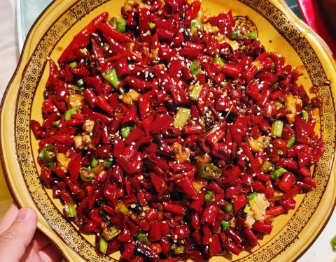 满盘的绿色尖椒,鸡肉麻麻辣,给了超级多花椒,藤椒,够爽! 招牌尖椒,一上来我惊呆惹