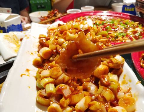 磁器口古镇去完之后,坐了几站地铁就到了马房湾66号,下午2点半左右到的,还是有几桌人在吃的,想点一份天下第一蒸,被告知需要提前预定的,有点小遗憾,最后点了一份招牌的鱼,口感不错,也没觉得很辣,还有一份白切鸡,本以为和我们知道的一样结果却是撒满了辣油,吃了辣的之后当然要来一份冰粉解辣,还有红油粑粑也特别的好吃
