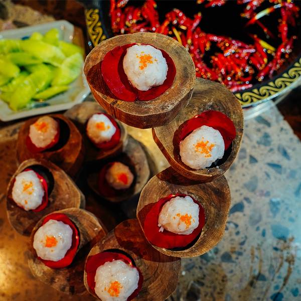 吃起来很嫩很入味 虾滑和红汤锅很配,牛肉也比较嫩,有肉感且吸收了红汤的麻辣香。这个一定要尝尝!超级绝