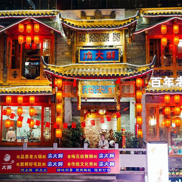 渝大狮老火锅(解放碑店) 这家高端大气上档次的火锅店从门面就是及其吸引人民眼球的 门前高高挂起的大红灯笼十分喜庆 而且每晚七点在店里还有表演 火锅+表演这笔帐怎么算都不会亏 更何况这家店的评价也很高 来...