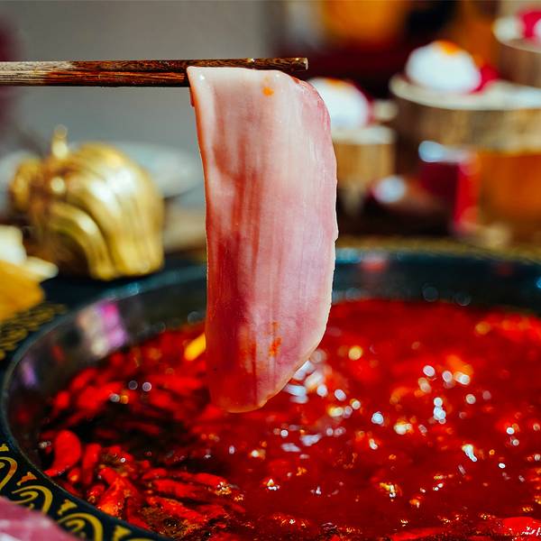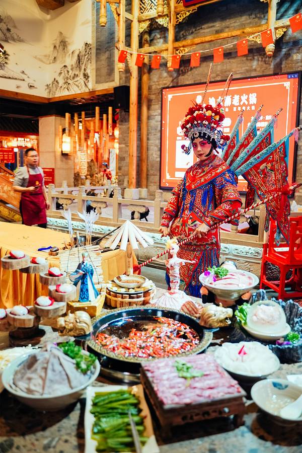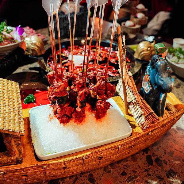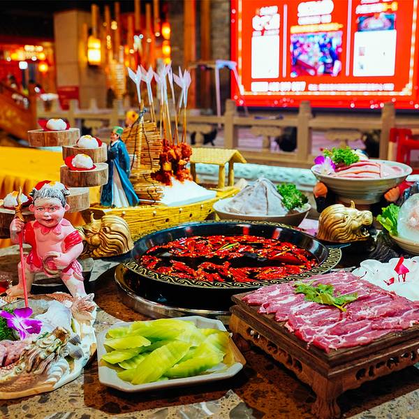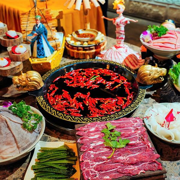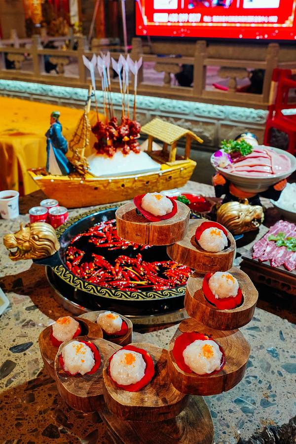 来吃火锅啦!上次我来重庆吃的就是他们家,这次来又来再吃一次。 位置在解放碑得意世界二楼,很好找的一个地方 😄😄😄我已经轻车熟路了。店内装修大气!明黄的灯笼,甚至还有一个大舞台,我天。在饭点的时候会演出一些重庆传统的节目,我之前第一次看的时候也是吃惊,因为之前也只看过海底捞的表演。他家的屠宰场毛肚是真的蛮有名。据说从屠场到上桌不超过十二个小时。属实无敌! 冰川白海鸭肠(我之前就问,海鸭??鸭子还有生长在海边的吗?哈哈哈我一直孤陋寡闻以为鸭子就是河边养养) 下锅烫几下之后, 捞起来便是爽脆可口,鸭肠还带有锅底香辣鲜香,海鸭的感觉真的和家庭饲养的鸭子不一样可以尝尝。这个一定要尝尝!很好吃。超级绝。摆盘的造型是猪八戒~吃起来很嫩很入味看师傅在现场做豆皮(?)对我来说都还蛮新奇。他们家的造型真的一绝。步步高升虾滑,草船借箭。哈哈哈,很有趣。荤菜都不错。虾滑和红汤锅很配,牛肉也比较嫩,有肉感且吸收了红汤的麻辣香。不算很辣。