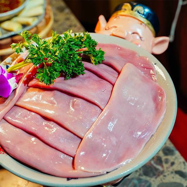 渝大狮老火锅(解放碑店) 这家高端大气上档次的火锅店从门面就是及其吸引人民眼球的 门前高高挂起的大红灯笼十分喜庆 而且每晚七点在店里还有表演 火锅+表演这笔帐怎么算都不会亏 更何况这家店的评价也很高 来了不吃就是遗憾 这家店就是:渝大狮老火锅渝大师老火锅给人的第一感觉就是高大上 店内环境非常大,一进门就可以看到整个大堂 大堂的中间是一个戏台子,每天晚上就是在这里表演 二楼是阁楼式的结构,可以在上面看下面表演的节目 装修风格也很独特,很有巴蜀感觉 整个大堂大气明亮 在这种环境用餐心情绝对是特别好的鲜切吊龙黄牛肉 以往吃吊龙一般都是在潮汕火锅店里才会吃到 没想到渝大狮家居然有 那肯定是要尝一尝的 果不其然 吊龙味道十分鲜美,没有经过任何佐料的腌制,整个牛肉就是原汁原味的 在牛油锅里翻滚之后整个味道得到了升华 牛肉十分有嚼劲 不论是蘸油碟还是干碟都别有一番风味屠宰场毛肚 这个毛肚叫屠宰场毛肚是因为它新鲜 如果是按照分量的话应该叫它“巴掌毛肚” 因为毛肚真的是太大了,跟巴掌一样 吃起来十分过瘾 毛肚新鲜厚实,七上八下保证了口感的脆嫩 蘸上油碟更是一秒钟就爱上它!八戒腰片 在重庆,没有一头猪的腰子可以免除被做成腰片的命运 二师兄的腰子也不例外 渝大师家的腰片真的是太太太太太片了吧 涮个十五秒就能吃了,而且没有一点猪腰的腥臊味 蘸上干碟好吃的不要不要的草船借箭 十分富有创意的一道菜 船上插着被做成箭的小郡肝 小郡肝麻麻辣辣的很有嚼劲哦玫瑰虾滑 每一颗虾滑都很大,下面是用玫瑰花瓣托着的 整整一颗都是巨大的虾肉 上面的鱼籽给虾滑增加了口感 咬起来咯吱咯吱的 好吃!功夫土豆片 这样的土豆片是我第一次吃 口感跟普通的土豆片完全不一样 煮的时间也很短 重要的的吃起来超级脆 而且会比普通的土豆片更加入味 没吃过的小伙伴绝对不能错过的菜品现捞特色豆皮 这道菜不是涮在火锅里面吃的哦 豆皮里面卷着黄瓜,蘸上碗里的秘制蘸料就可以吃了而且可以看到豆皮的制作过程,豆皮的新鲜有保障 点赞点赞七点的时候正好有表演 吃着火锅看着表演实在是太幸福了 这顿饭吃的一点也不亏啊地址:重庆市渝中区磁器街得意世界2楼 营业时间:9:30~次日3:00