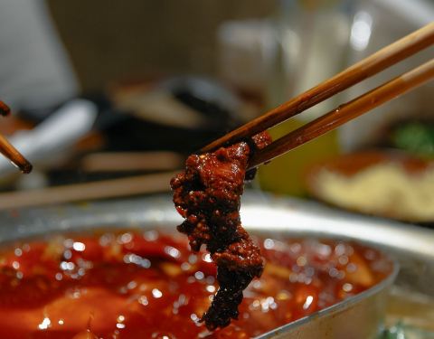 店面不大,店内装修依然保留着老重庆的市井,墙上有涂鸦,在重庆吃火锅,吃的就是这口江湖气。满满一锅的牛油、花椒、干辣椒,看着就过瘾。