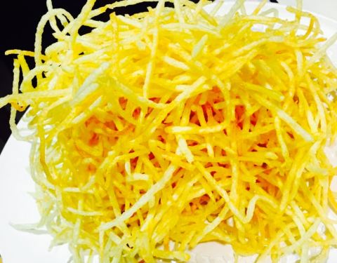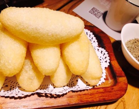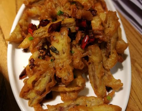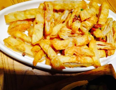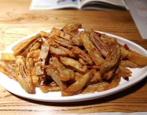 花椒煸藕夹有点麻辣,开胃了;芝士焗番薯用的无盐黄油,芝士很厚,也不是很甜,这点很好