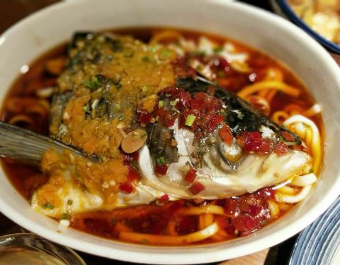 一碗自然不够喝,吃肉喝汤,再填一碗鸳鸯剁椒蒸鱼头:黄红两色椒酱覆盖再鱼头上,下面垫了土豆粉,鱼...