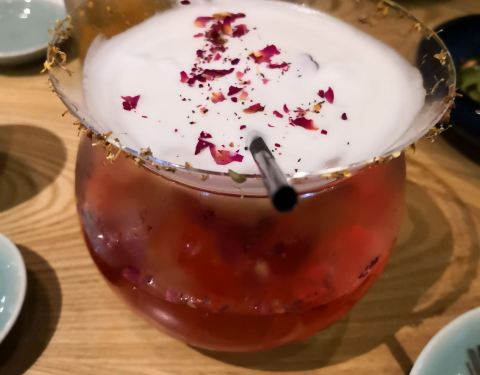 深圳出差,工作都圆满完成了,最后一晚当然是嗨皮一下了。朋友带着我们来到这家大圣酒场,一楼处比较日式风格的介绍和照片,但是上了电梯进店后的感觉完全不一样,比图片宣传的还华丽一些。相当于日本的居酒屋风格,年轻人居多,我们人多找了一个单间。相比于料理,他们家的酒水还是比较有特色的,类似日本的各种调酒,让人想都品尝一下。菜品等味道都不错,量不算大。好多时尚女孩去换和服拍照片,搞的一段时间内花姑娘满店跑。点中央部位有个舞台,有驻唱歌手不定时的唱些日本歌曲。环境口味都不错,适合聚会和约会的特色店。
