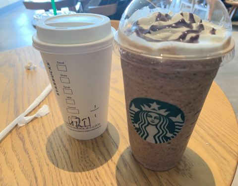 由于住在附近,隔了一天,又来这家星巴客了。从地铁的出口出来没几步就到星巴客,对面就是武汉体育中心。来这店时,看见里面座位挺多的,但基本上已经坐满了,可见这店还是蛮受欢迎的。店里的环境还不错,比较安静,大家也较为自觉。这次点的是抹茶拿铁和摩卡可可碎片星冰乐,个人觉得口味还是不错,在此坐一会儿,稍微休息下也蛮好的。