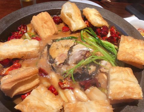 承德游第二顿晚餐,“太子宴”,依然是点评搜到的餐厅,是一家精致的中餐厅。 环境:装修现代时尚,又有中式特色。有茶水、有果盘配送,精致到位。 菜品:乾隆大鱼头半份,招牌菜。鱼头够大,特色是要陪他家现炸的油条。北京吃的鱼头大多是泡饼,这个泡现炸的油条还是有一回吃。油条外皮脆,吸足了鱼头的汤汁还是很鲜美的。 石锅海胆豆腐,热呼呼的,非常适合小雨中落座的一道菜。海胆附在豆腐上,依稀可见,豆腐汁浓郁。 红糖油饼,也是他家的特色。上来已经给切开了。颜值在,味道一般,上面的棕色不是完全的红糖,不酥,好像有巧克力似的.. 人均一百多一些这个价格在这里还是不错的体验!