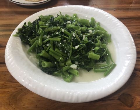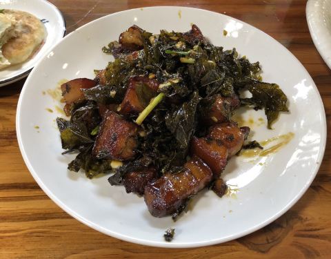 外婆湾就在小伙伴住的绿城度假酒店对面,来千岛湖,鱼头浓汤必点,但是又想尝尝剁椒味的,套餐里没有一鱼两吃完美的解决了这个问题。鱼头烧汤,雪白的鱼汤一看就是炖了很久的,喝一口,果然鲜美。剁椒鱼肉,又是另一番风味了,开胃又下饭。 茶香肉,与红烧肉不一样的美味,五花肉先过油,再跟茶叶等调料一起煮,吃起来没那么油腻,平时不爱吃肥肉的我也吃了好几块肥瘦相间的茶香肉。隔壁桌的几个大姐看我们吃的香,跟服务员说她们也要来一盘。 蒜泥菠菜,天气热,多吃蔬菜,健康又可以补充维生素。 外婆菜饼也是店里的招牌,上菜时服务员叮嘱要趁热吃。韭菜肉馅的,有点像北方的韭菜盒子,在杭州市里很少能吃到。