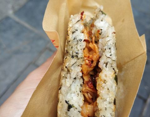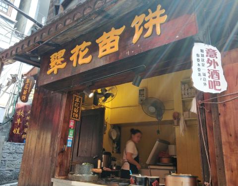 没去凤凰之前看到过一篇攻略上推荐翠花苗饼。苗饼?没听过,好奇什么味道?就一直留意着。到凤凰古城入住后闲着没事,特意找过去尝一下。 街边的一家小店,只能外带。 苗饼应该就是两面煎过的糯米饭做的饼,内里夹上一些腌萝卜之类的。味道还不错,就是10块一个的价格,不是很实惠。